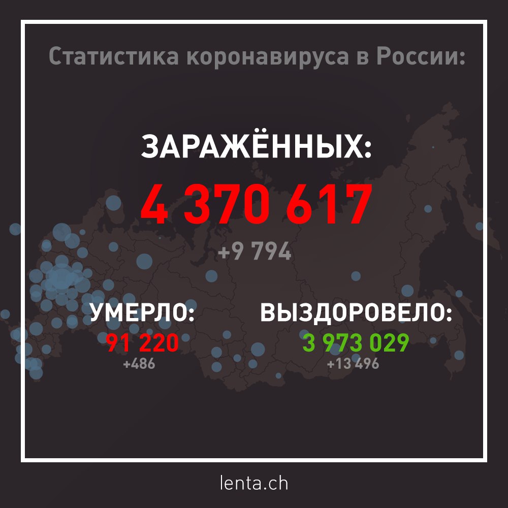 В России за сутки выявили 9 794 новых случая коронавируса в 85 регионах. Из них 1610 — в Москве, 957 — в Санкт-Петербурге, 476 — в Московской области, 375 — в Нижегородской области.