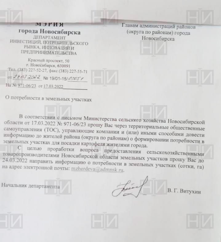 В распоряжении «Новой искренности» оказалось письмо из мэрии Новосибирска, в котором городские власти просят глав районов, УК и ТОСы убедить граждан начинать засевать картофан. Видимо, прямо рядом со своими многоэтажками.