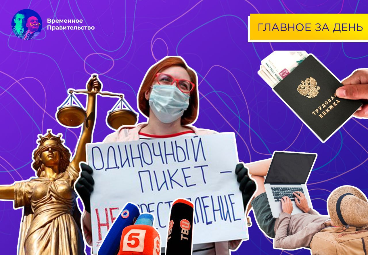 У Петровки, 38 арестовали 20 журналистов, которые устроили одиночные пикеты после ареста журналиста Ильи Азара, тоже устроившего одиночный пикет. Законность таких арестов сомнительна, но компенсируется настойчивостью в действиях: ни шага в сторону!