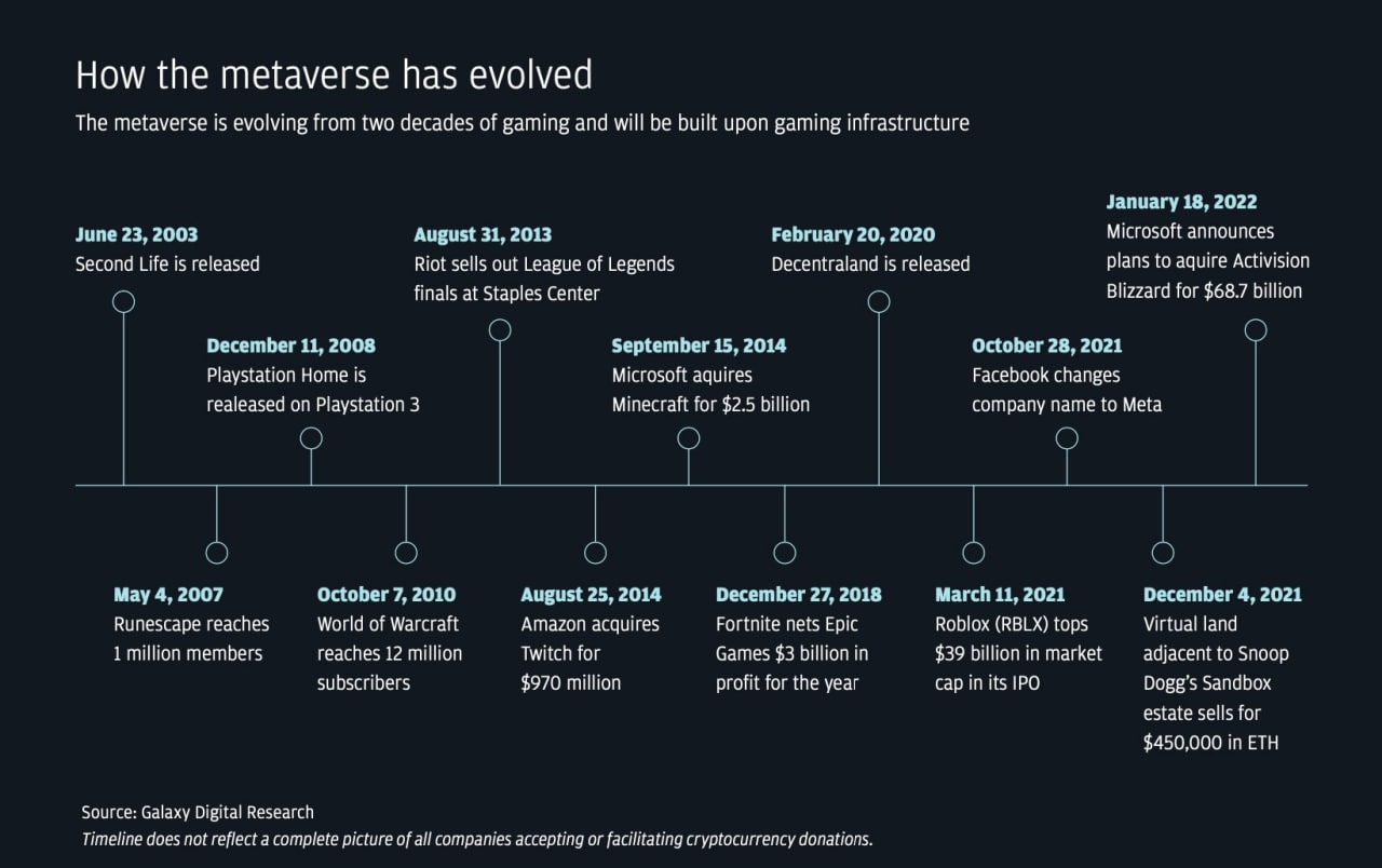 От Second Life в 2003 и первого миллиона юзеров Runescape в 2007, до трансформации Facebook в Meta и виртуальных земель Decentraland по $450000