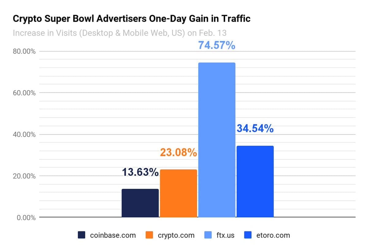 📊Отчет Similarweb об однодневном приросте трафика на криптобиржи, реклама которых размещалась во время Super Bowl