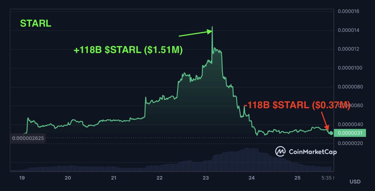 Неизвестный пользователь всего 2 дня назад закупился на бирже Gate 118 миллиардами токенов STARL (на $1,51 млн), выведя на свой кошелек, а уже сегодня снова их завел на биржу