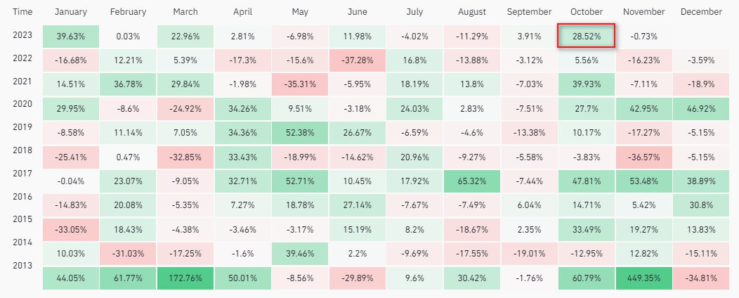 Это второй лучший месяц в 2023-м году, и пятый лучший октябрь в истории биткоина
