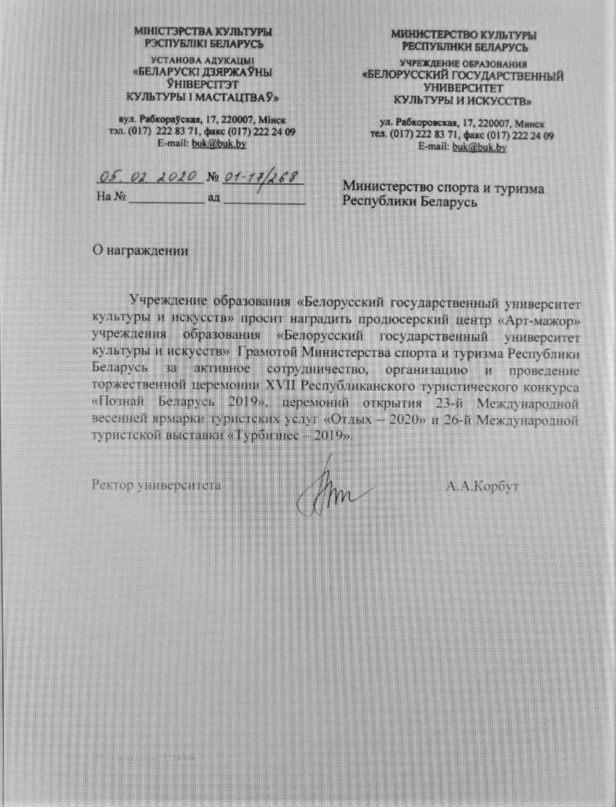 На свет божий эта ситуация полезла из-за странного письма, полученного министерством спорта из Белорусского государственного университета культуры и искусства. Ректор "кулька" Алина Корбут просила наградить продюсерский центр "Арт-мажор" грамотой Минспорта. Не просто так, а за активное сотрудничество, организацию и проведение торжественной церемонии XVII Республиканского туристического конкурса «Познай Беларусь 2019», церемонию открытия 23-й Международной весенней ярмарки туристических услуг «Отдых – 2020» и 26-й Международной туристической выставки «Турбизнес – 2019».
