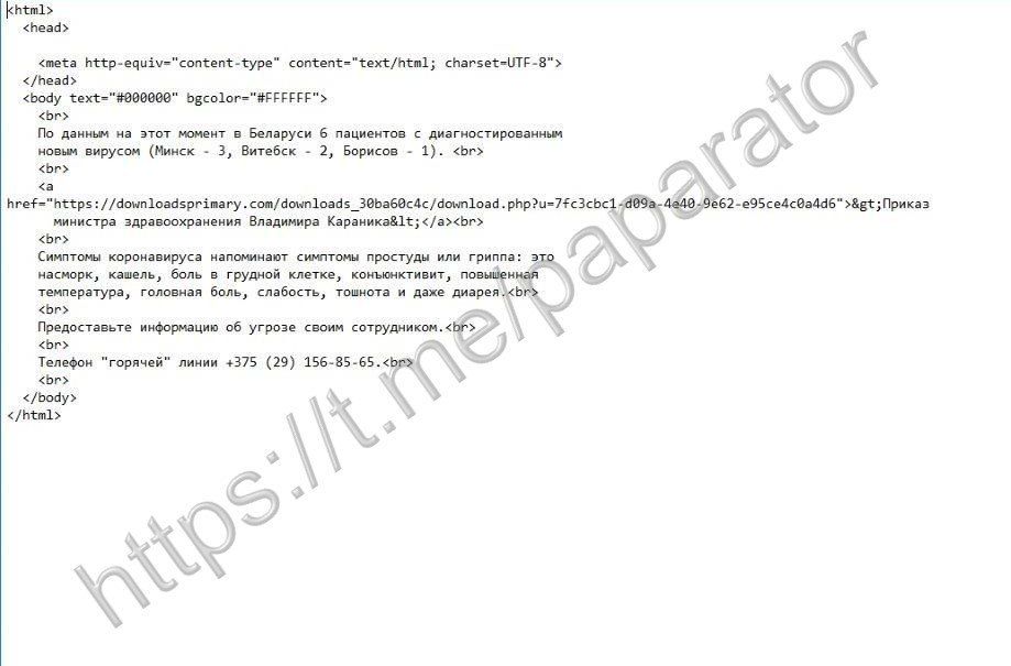 Сенсация: коронавирус уже в Беларуси! Вчера Минский центр гигиены и эпидемиологии массово рассылал по электронной почте информацию об уже 6 случаях китайской заразы, поразившей белорусов. Для убедительности в теле письма приводилась ссылка на приказ министра Караника. Известие, конечно, оглушает, а руки сами тянутся к любимой марлевой повязке. Но не спешите паниковать! Тревожная рассылка была произведена со взломанного ящика медицинского учреждения, находящегося на почтовом сервисе tut.by. А активная ссылка на приказ министра приводит к скачиванию трояна.