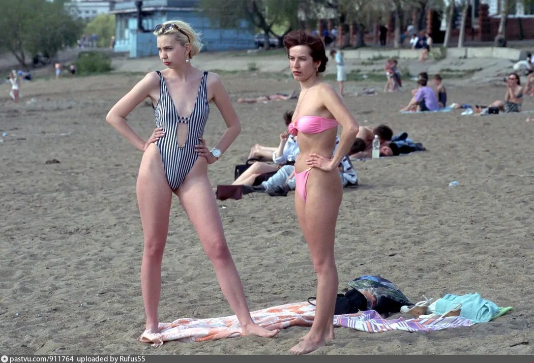 ​​Две сибирячки загорают на пляже Омска, 1998.