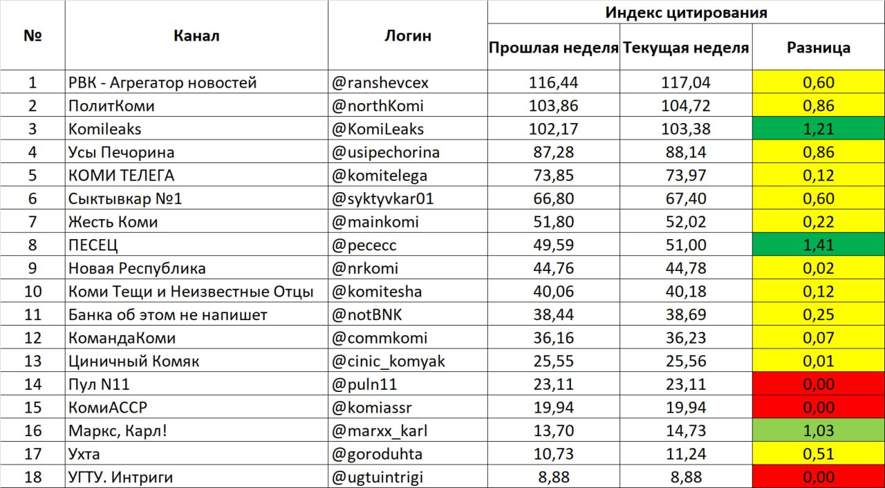 Выходной день вчера был на календаре, а это значит, что пора знакомить читателей с рейтингом цитирования каналов местной коми поляны по итогам прошедшей недели. В понедельник уже все показатели пришли в норму, поэтому сегодня более точная статистика.