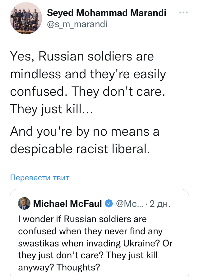 Сейед Мохаммад Маранди с сарказмом и стёбом ответил Майклу Макфолу в Twitter: