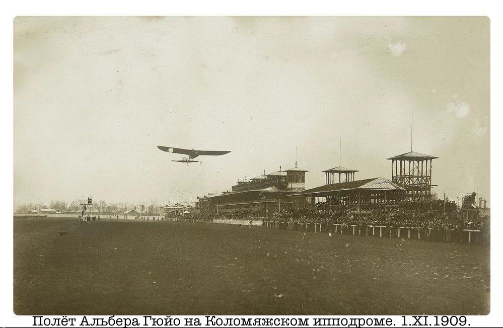 1-го ноября на ипподроме в Коломягах состоялся полёт Альбера Гюйо на моноплане «Блерио». На этот раз ожидания зрителей были блестяще удовлетворены. Два полёта оказались вполне удачными. Небывалое ещё в Петербурге зрелище человека в воздухе наподобие птицы, изящно и легко парящего над землёй и передвигающегося по заранее выбранному направлению, вызвало взрыв восторга у многотысячной толпы. Руль сзади поднимается, моноплан бежит несколько сажен на двух передних колёсах, потом отделяется от земли и плавно устремляется вверх. Несколько грациозных движений вниз и вверх рулём, и Гюйо утверждается на высоте в 12 или 15 метров. Под гром аплодисментов и восторженные крики публики авиатор быстро летит мимо трибуны. После приземления Гюйо согласился описать в воздухе ещё один круг — на bis. Красиво обогнув ипподром, Гюйо опускается у беседки судей. Новая овация. Публика расходится очень довольная редким спектаклем.