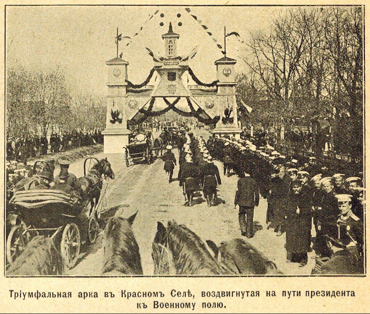 В присутствии Их Величеств и президента Лубэ в Красном Селе состоялся блестящий парад войск. После Высочайшего смотра в Большой обеденной палатке в Красном селе роскошно убранной экзотической зеленью и цветами, состоялся Высочайший завтрак.