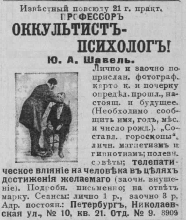Среди этих гадальщиков и прорицателей четверо имеют дипломы высших учебных заведений, 2 — отставные офицеры, 11 — чиновники гражданского ведомства, 7 — бывшие учителя и остальные принадлежат к лицам, получившим «домашнее» образование.