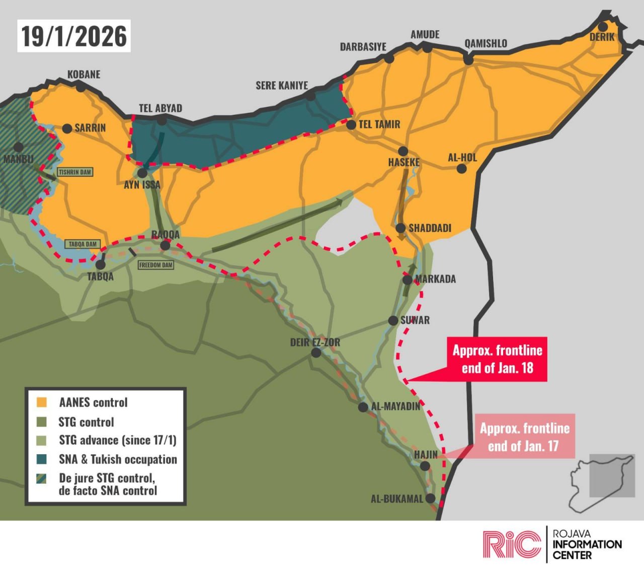 Пока сенатор грозит, положение курдов стало еще хуже. Несмотря на достигнутое вчера соглашение о прекращении огня, линии фронта военной операции Сирийского переходного правительства (STG) на север и восток Сирии быстро меняются. Плотина Тишрин и Айн-Исса перешли под контроль джихадистов, идет продвижение в направлении Кобани.