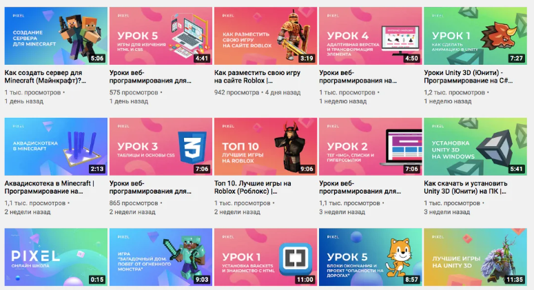 Плейлисты на нашем YouTube-канале охватывают такие популярные программы, как Scratch, Scratch Junior, Kodu Game Lab, Roblox Studio, Unity 3D, программирование на Python в Minecraft, создание сайтов на HTML и CSS и др.