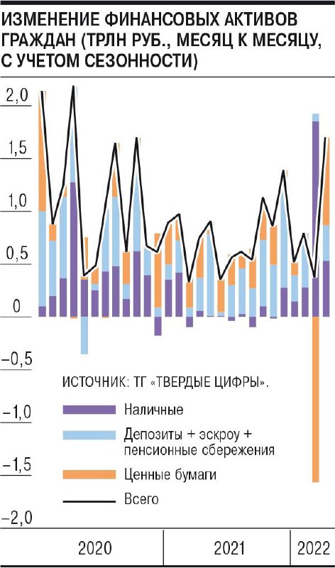 По данным ЦБ, средства населения в банках (без счетов эскроу) в апреле выросли на 1,3 трлн руб. (3,8%), в том числе за счет возврата в банки ранее снятых наличных, это почти полностью перекрыло отток февраля—марта (около 1,4 трлн руб.), на фоне первого за долгое время сжатия кредитования физлиц.