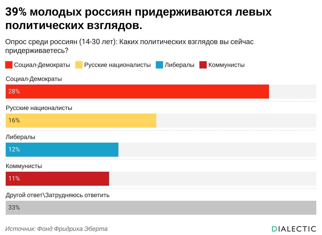 Согласно опросу Фонда Фридриха Эберта, 39% молодых россиян придерживаются левых (социал-демократы+коммунисты) политических взглядов.