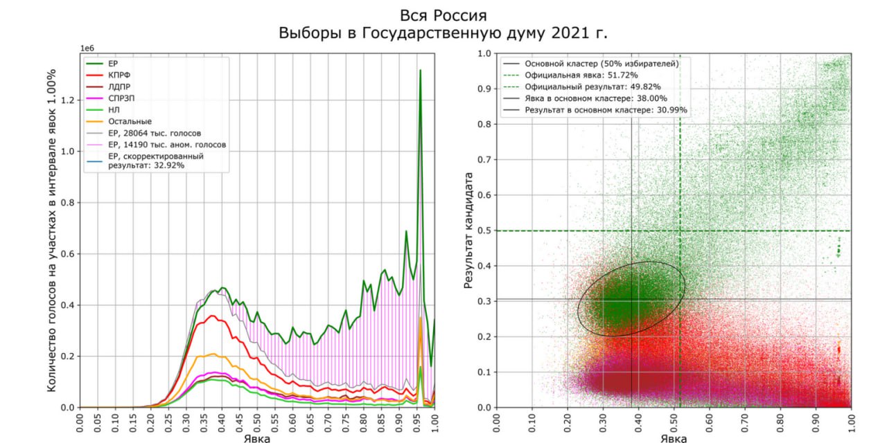 Иллюстрация: гистограмма и диаграмма по результатам выборов в Госдуму 2021 года в пропорциональной системе за авторством Шпилькина в координатах «явка — результаты партий».