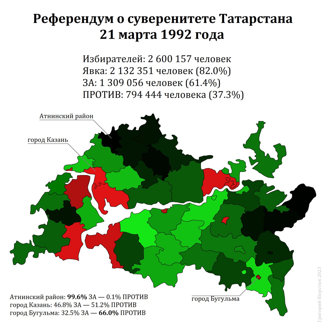 Есть другая, не менее замечательная Республика — Татарстан. В 1992 году на фоне обострения отношений региональных элит с федеральным центром вокруг распределения нефтяной ренты там прошел референдум о государственном суверенитете — официально 61,4% при явке в 82% высказались за. Если мы посмотрим на итоги голосования по территориям (см. картинку), то увидим интересное — вариант ЗА провалился на ТИКах в городской местности, но зато сельские дружно показывают итоги голосования вплоть до 99% (!) голосов ЗА при явке в 99% (!). Как вы думаете, какова природа столь дружного волеизъявления? Насколько вообще возможно, чтобы в реальной жизни пришел такой процент избирателей и столь единодушно голосовал за один вариант? Спустя 30 лет прогрессивные деколонизаторы кормят свою аудиторию вот этим и ссылаются на в т.ч. результаты этого референдума, чтобы показать, как бедные угнетенные народы хотят жить в настоящей швободе от проклятой империи. А Татарстан продолжает каждый электоральный цикл участвовать во Всероссийском конкурсе по рисованию (хе-хе).