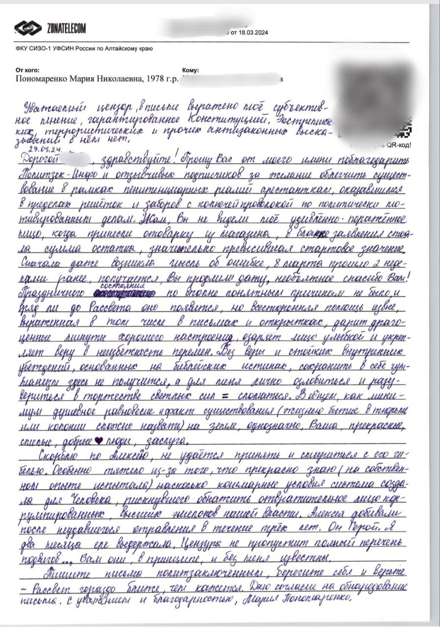 «Уважаемый цензор, в письме выражено мое субъективное мнение, гарантированное Конституцией. Экстремистских, террористических и прочих антизаконных высказываний в нём нет. 24.03.24