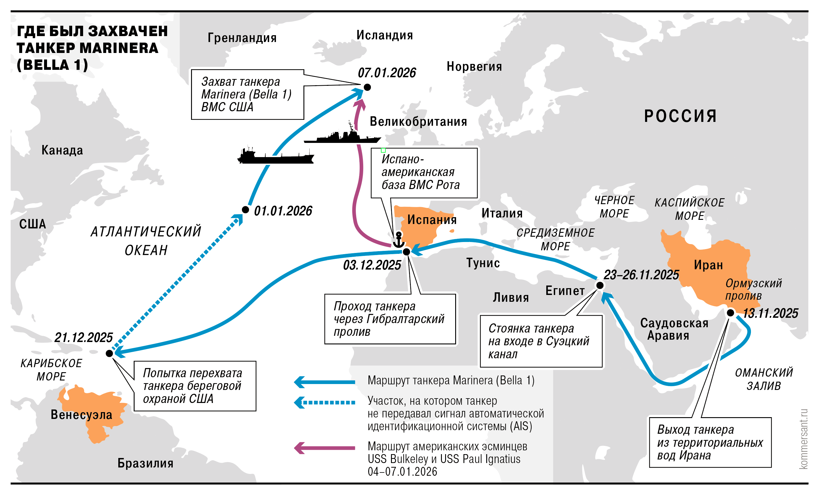 Американцы захватили Николаса Мадуро 3 января сего года на фоне резкого обострения ситуации в Иране. 7 января американцы захватили танкер "Маринера", шедший в тот момент под российским флагом. В связи с захватом танкера важно знать, 13 ноября 2025 г. танкер "Маринера"… покинул Ормузский залив. Корабль направлялся в Венесуэлу из Ирана. Или все же иранская нефть в его трюмах не предназначалась для доставки в Венесуэлу? Тогда куда доставлял нефть танкер, захваченный США? Вот в чем вопрос.