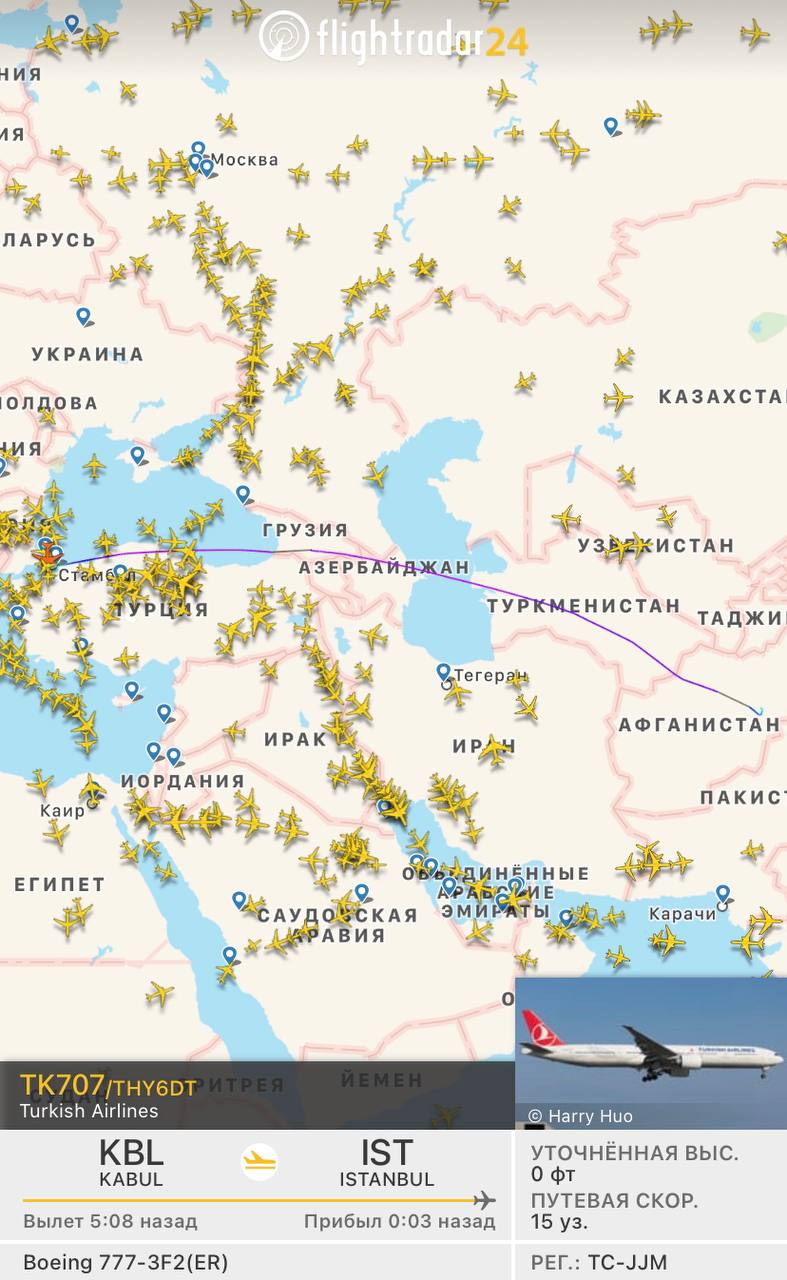 Turkish Airlines сегодня выполнили рейс из Кабула в Стамбул. Boeing 777 вылетел из Афганистана на пять часов позже расписания и только недавно приземлился в Турции.