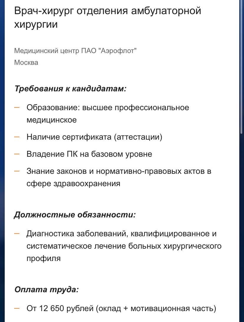 Нехватка медперсонала заметна и на сайте "Аэрофлота", где размещено больше двух десятков вакансий врачей и медсестер. Перевозчик ищет сотрудников только в московский медцентр.