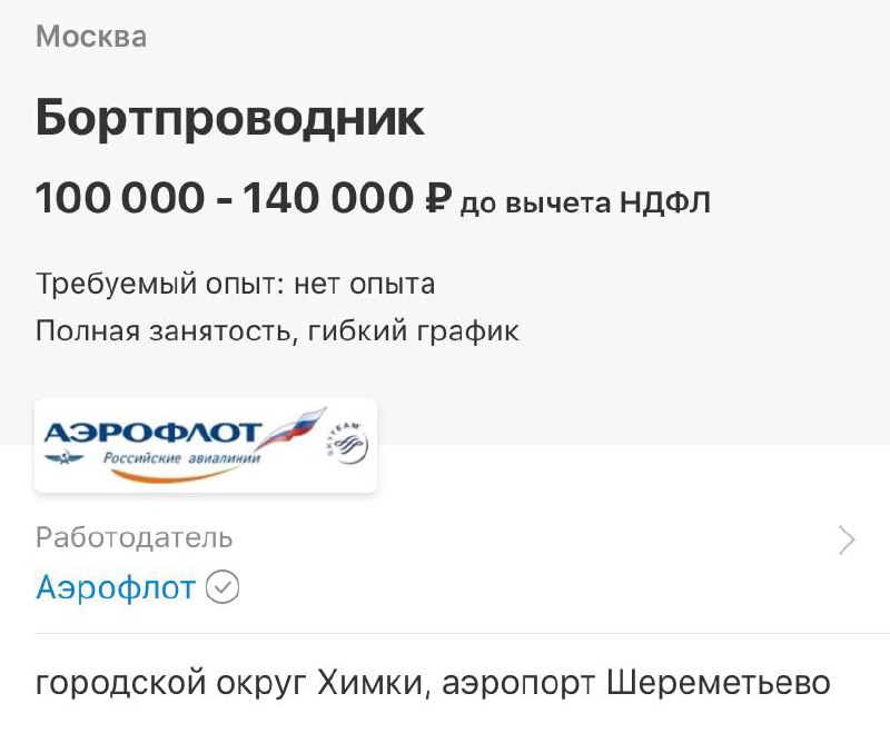 Действующие бортпроводники нацпера утверждают, что им таких денег не платят. И это неудивительно, если зарплата второго пилота в "Аэрофлоте" упала за пандемию до 130 тыс. рублей, а командира - до 200 тыс.