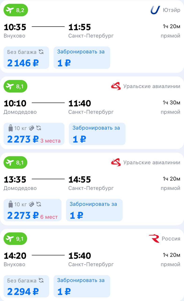 Опция распространяется не на все авиакомпании и перелеты. Сейчас за 1 рубль можно забронировать некоторые билеты "Аэрофлота", S7, "России", "Уральских авиалиний", UTair, Smartavia и других перевозчиков.