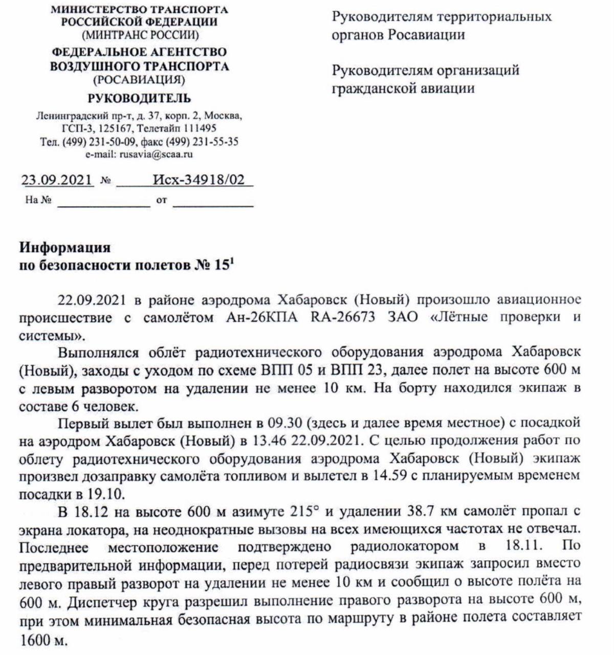 Росавиация разослала руководителям авиакомпаний и других организаций гражданской авиации информацию по безопастности полетов №15.