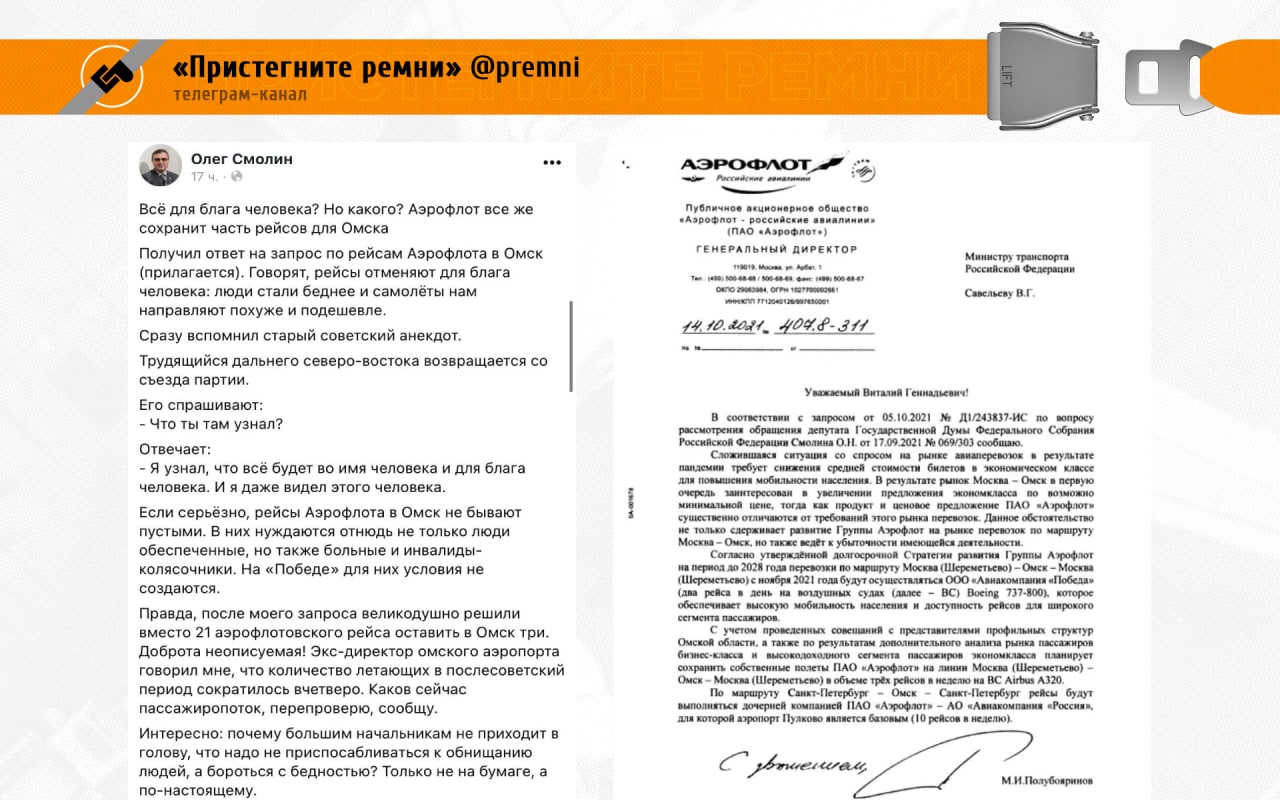Политик опубликовал в своих соцсетях официальный ответ главы нацпера на запрос по рейсам "Аэрофлота" в Омск.