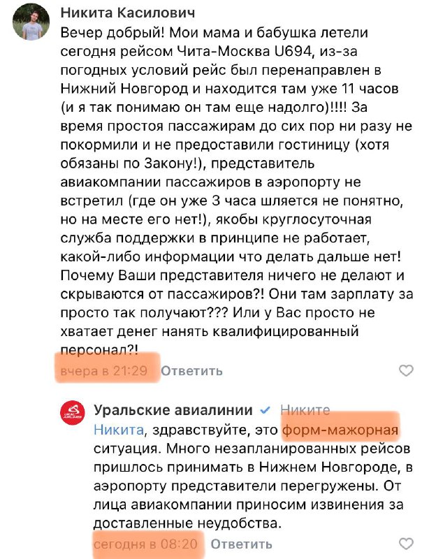 "Уральские авиалинии" отвечают на вопросы пассажиров долго (вплоть до 11 часов), с ошибками и далеко не всем. Но их клиентам к задержкам и наплевательскому отношению авиакомпании не привыкать.