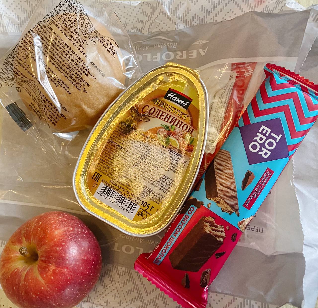 Питание на некоторых рейсах с вылетом из регионов в столицу тоже весьма скудное. К примеру, на фото - еда на утреннем рейсе Ульяновск-Москва. Паштет стоимостью около 60 руб. за упаковку едва ли соответствует кейтерингу премиальной авиакомпании. При этом на рейсе из Москвы сохраняются традиционные аэрофлотовские сэндвичи.