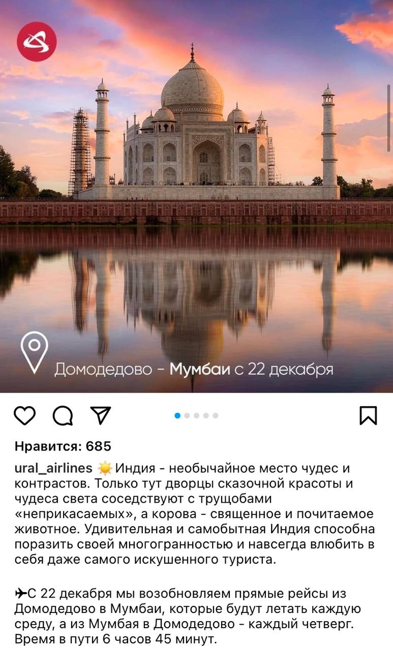 "Уральские авиалинии" анонсировали старт полетной программы из Москвы в Мумбаи с 22 декабря, хотя Оперштаб не добавил направление в число разрешенных. Билетов на сайте авиакомпании по заявленному маршруту нет.