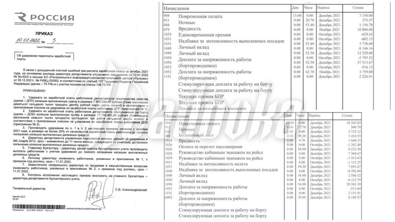 Теперь "Россия" удерживает часть средств из их зарплат "в связи с допущенной счетной ошибкой при расчете заработной платы за октябрь 2021 года".