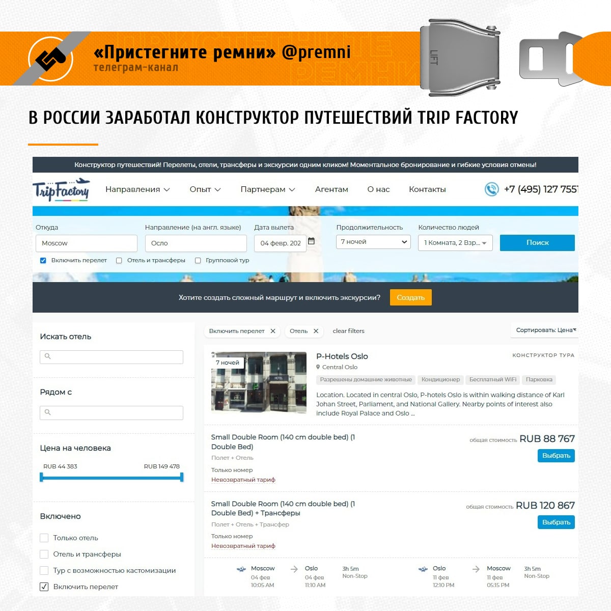 К примеру, тур (перелет+отель) на 7 ночей в Норвегию, которая теперь открыта для россиян, на Trip Factorу стоит 88,8 тыс. руб. на двоих. Если брать эти же билеты Москва-Осло ("Аэрофлот") и отель через Mego Travel и Booking, цена получается ниже - 84,8 тыс. При этом Trip Factorу предлагает невозвратный тариф, тогда как Booking - бесплатную отмену проживания.