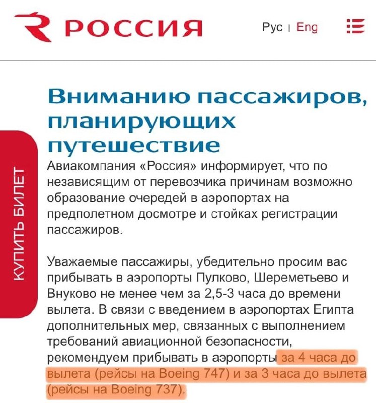 Наша подписчица, которая на днях вернулась из Египта рейсом Хургада - Москва авиакомпании "Россия" на Boeing 747, отмечает, что из отеля их должны были забрать за 6 часов до вылета, чтобы привезти в аэропорт за 5 часов. При этом на сайте самой "России" рекомендуется прибывать в аэропорты Египта за 4 часа до вылета (рейсы на Boeing 747) и за 3 часа до вылета (рейсы на Boeing 737).