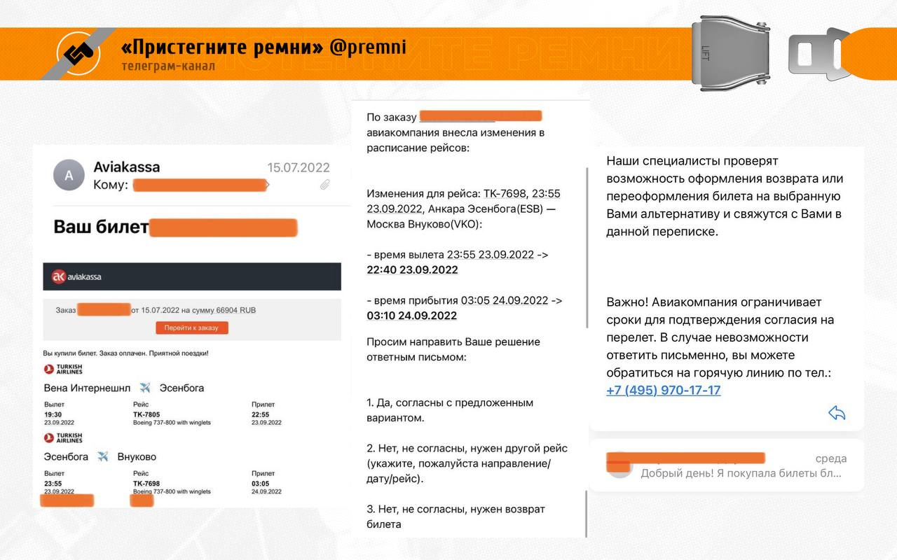 С турецкой авиакомпанией трудности возникли почти сразу. Рейс Анкара - Москва перенесли с 23:55 на 22:40, при этом рейс Вена - Анкара прибывает в 22:55, то есть пересадка пролетает автоматически. Остается два варианта: отказываться от поездки или ждать альтернативный вариант, который предложит авиакомпания.