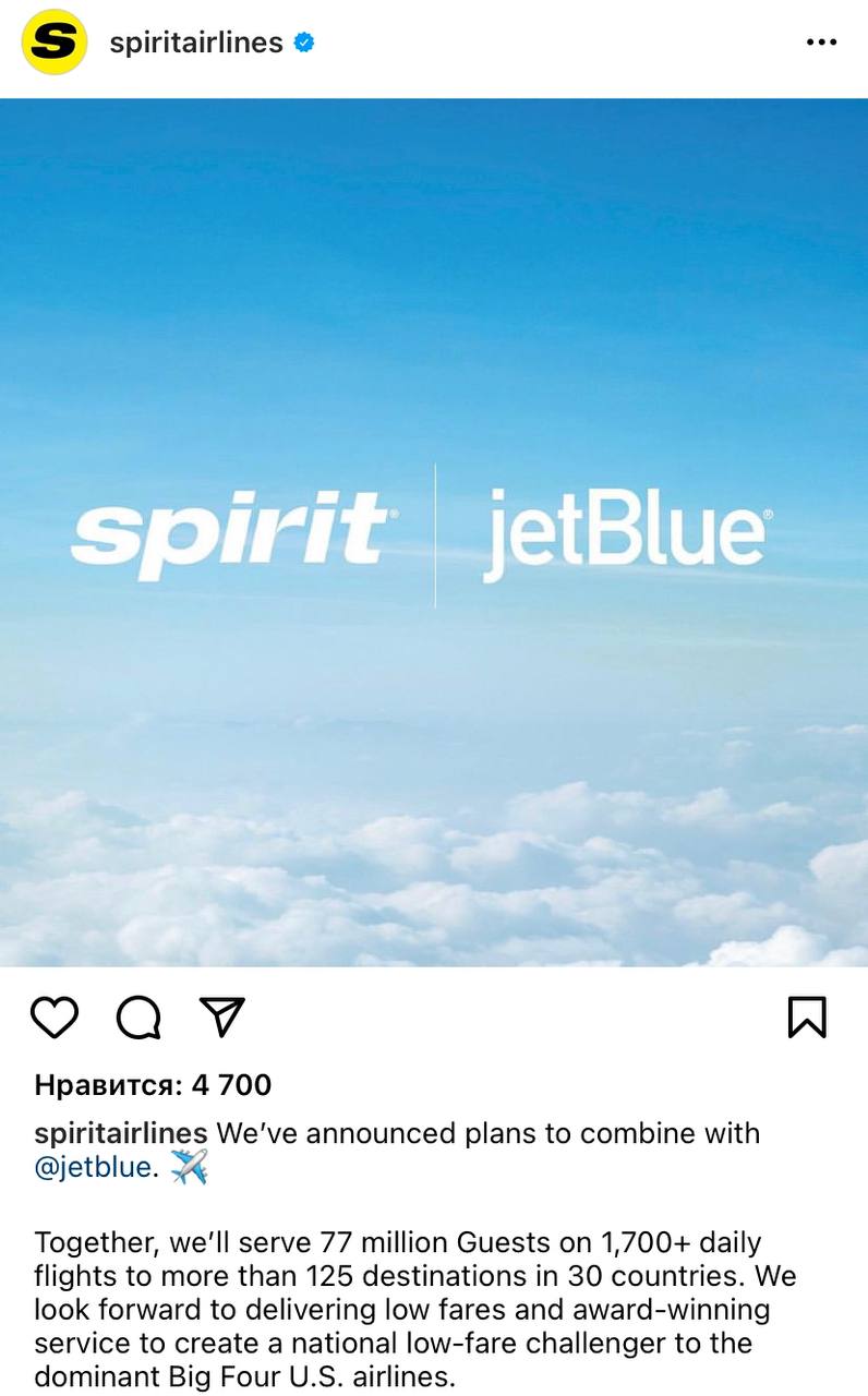 Американские бюджетные компании объединяются. Лоукостер JetBlue Airways собирается купить ультралоукостер Spirit Airlines за $3,8 млрд.