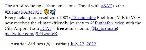 Австрийский совет по рекламе (AAC) постановил, что недавняя кампания Austrian Airlines, предлагающая "углеродно-нейтральные" рейсы из Вены в Венецию на художественную ярмарку Биеннале, на самом деле обманчива. Организация отметила, что тема может вводить в заблуждение относительно климатически-нейтральных полетов, которые (пока) невозможны. И порекомендовала использовать более точные формулировки.