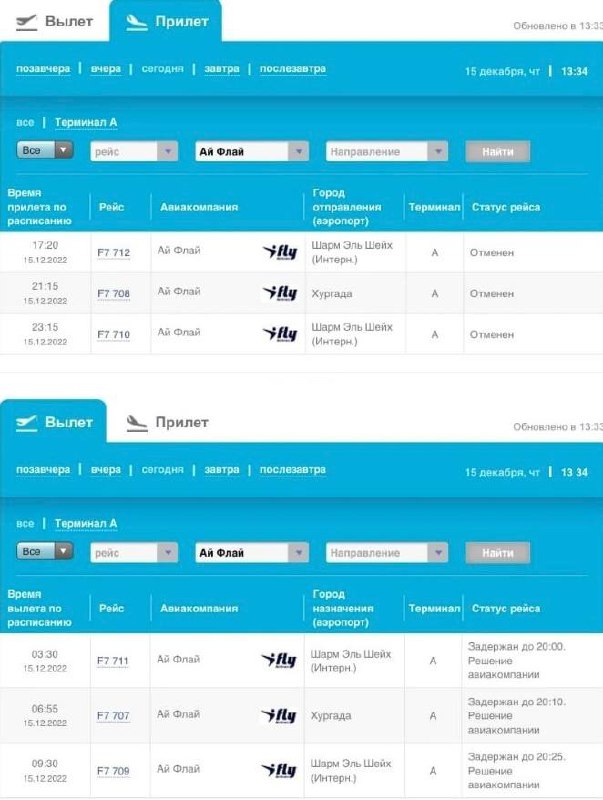 Вылеты в Хургаду и Шарм-эш-Шейх запланированы на сегодня, но уже задерживаются. Один рейс отменен.
