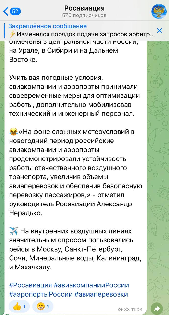 К новому для себя формату ведомство пока не привыкло, поэтому промахи случаются. К примеру, в свежем посте цитату руководителя Росавиации Александра Нерадько сопроводили смеющимся до слез смайликом. Хотя ничего забавного там нет: фраза о сложных метеоусловиях, с которыми успешно справлялись в праздники российские авиакомпании и аэропорты.