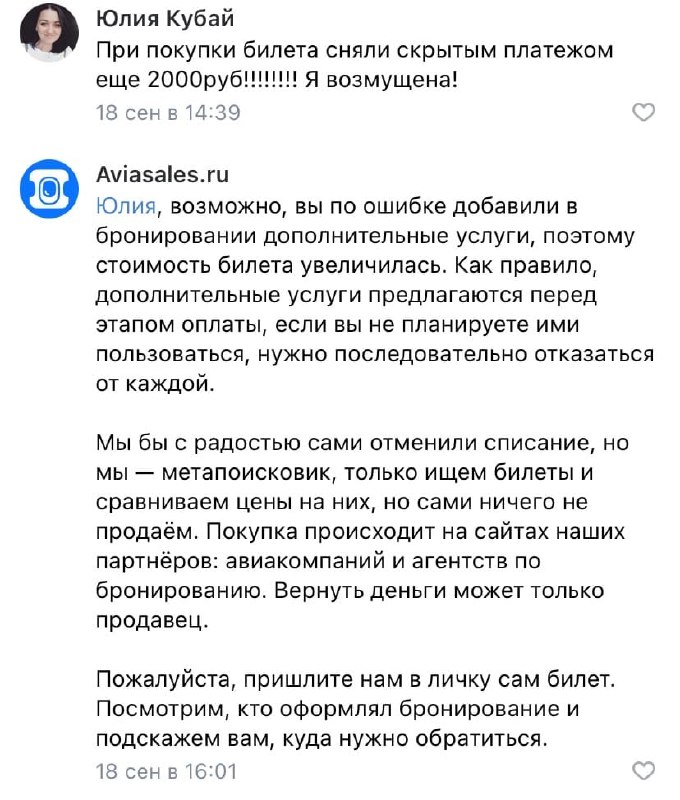 Билетный поисковик Aviasales с 1 сентября запретил авиакомпаниям по умолчанию добавлять в заказ дополнительные услуги (страховка, платный выбор мест и т.п.), как мы помним. Но клиенты все равно жалуются, что на этапе оплаты у них вылезают какие-то непонятные лишние суммы. Причем иногда не сотни, а тысячи рублей.