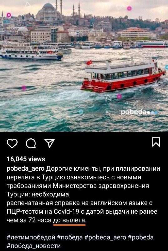 Хотя Турция требует, чтобы результат ПЦР-теста был не старше 72 часов до вылета. Такая же информация, кстати, указывается и на официальных страницах самой "Победы".