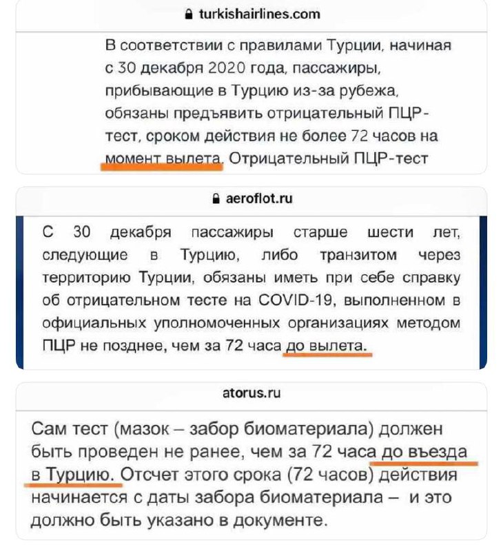 Вот и получается, что авиаперевозчики (причем не только "Победа", но также Turkish Airlines, "Аэрофлот" и другие) на своих официальных страницах пишут о том, что отрицательный тест на коронавирус должен быть сделан максимум за 72 часа до вылета, а большинство СМИ и туристических сайтов, в том числе АТОР, - за 72 часа до въезда в Турцию.