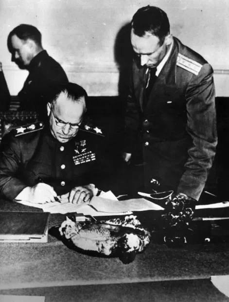В итоге ночью с 8 на 9 мая в берлинском предместье Карлсхорст акт о капитуляции был подписан второй раз. Представителем Главнокомандования советских войск был направлен маршал Георгий Жуков, а политическим юристом — Андрей Вышинский.