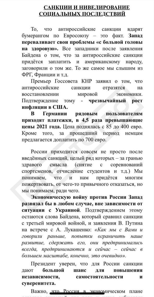 ▪️Главная мысль — европейцы сами пострадают от антироссийских санкций. «Это факт. Запад переваливает свои проблемы с больной головы на здоровую», — утверждается в «темнике». Более того, единороссов просят говорить, что «экономические последствия для Запада могут оказаться куда сильнее», чем для России.