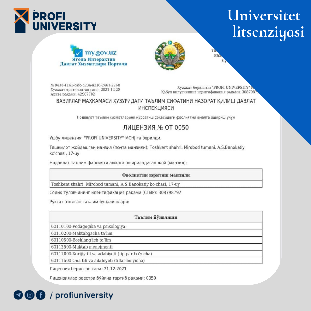 Ayni paytda abituriyentlardan hujjat qabul qilayotgan PROFI UNIVERSITY nodavlat oliy ta'lim tashkiloti diplomi O'zbekistondagi boshqa oliy ta'lim muassasalari diplomlari qatorida tan olinadi!