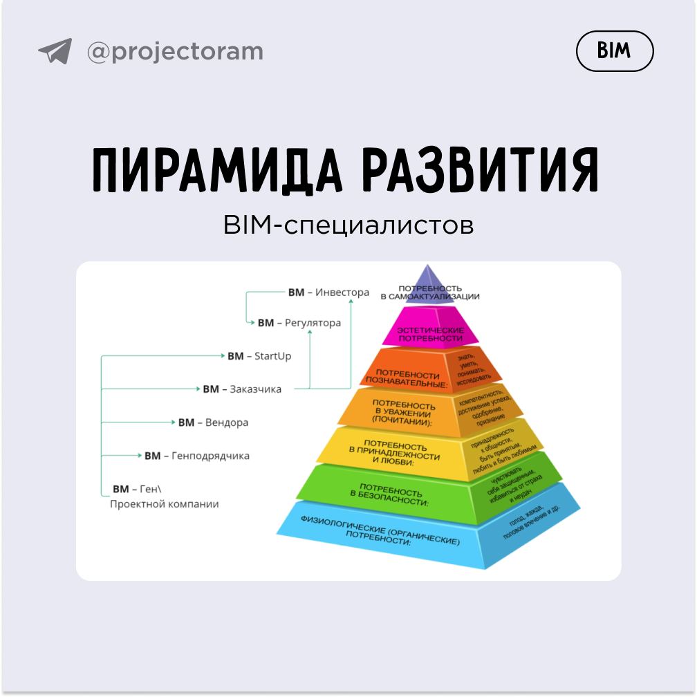 Предлагаем провести некоторую параллель с известной всем пирамидой Маслоу. Это весьма условное сравнение, но главная идея – показать трансформацию профессионального движения BIM-менеджера в процессе карьерного роста и целей – от простых к сложным и ответственным.