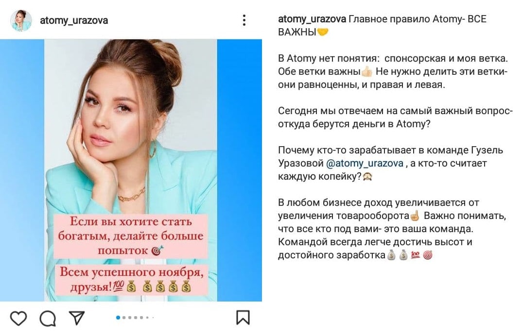 Народная MLMщица Татарстана и не менее народная артистка Гузель Уразова популярно объясняет членам своего «бизнес-клуба», как это работает: если вы никого не заманили в сетевуху Atomy Business, то и прибыли не будет. Принципы те же, как в финансовых пирамидах типа Финико и иже с ними.