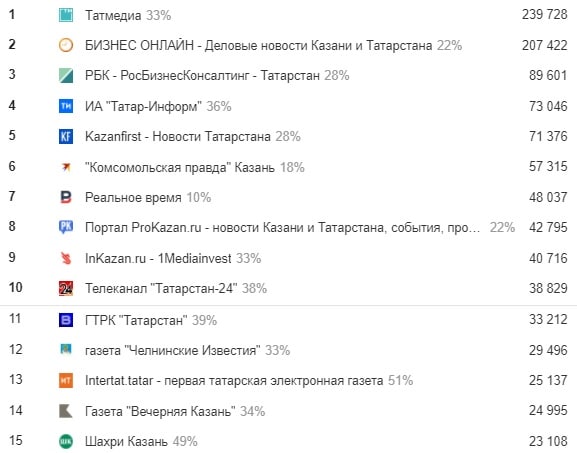 А вот за прошедшую неделю поменялись местами «Реальное время» и «Комсомольская правда», РВ сдало одну позицию. При этом в топ-10 вернулся сайт «Татарстан-24», сумевший подняться туда с 12-го места, и обойдя ГТРК «Татарстан», так и оставшийся 11-м.