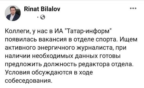 Тут ко вчерашнему обзору вакансий, где речь шла про «Татмедиа», на #почта прислали уточнение: выпускающего редактора они ищут в Татар-информ. Частично в офисе, частично на удаленке. Зарплата примерно 30 000 на руки. Ну, такое себе.